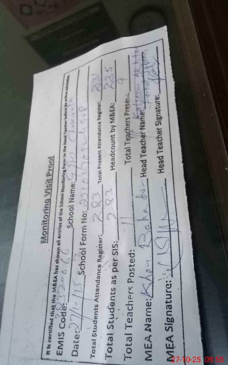 | Attendance Register | Head Teacher | MEA with School | Visit Proof |