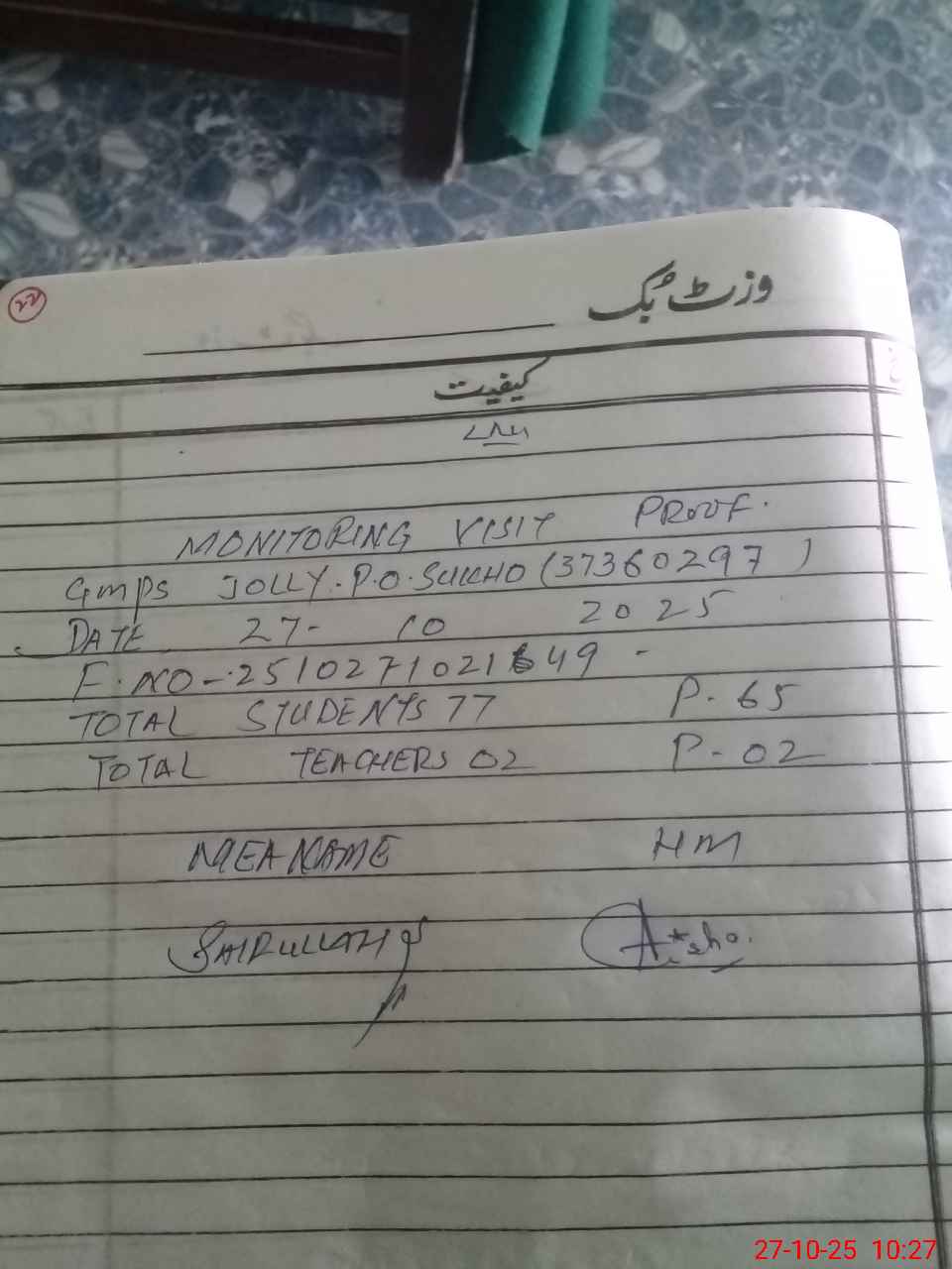 | EMIS Code: 37360297 | Name of School: GMPS JOLLEY P.O SUKHO | |||
