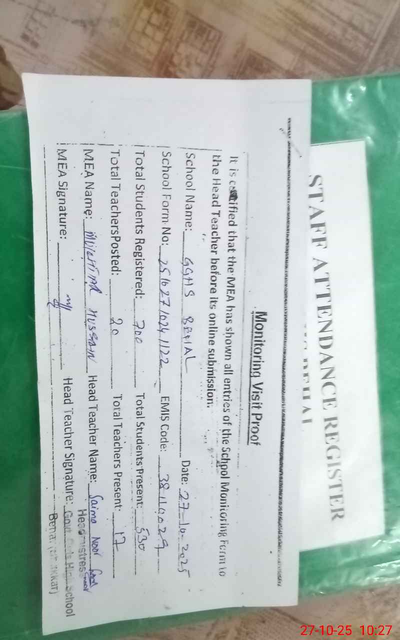 | Attendance Register | Head Teacher | MEA with School | Visit Proof |