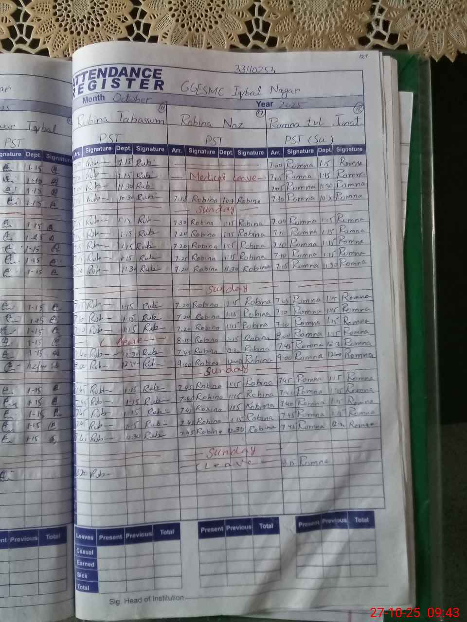 | 31**** | Ro**** Na**** | PST | Regular | 28 | 0 | 0 | 0 | 26 | 0 | 0 | 0 | 2 | Casual |