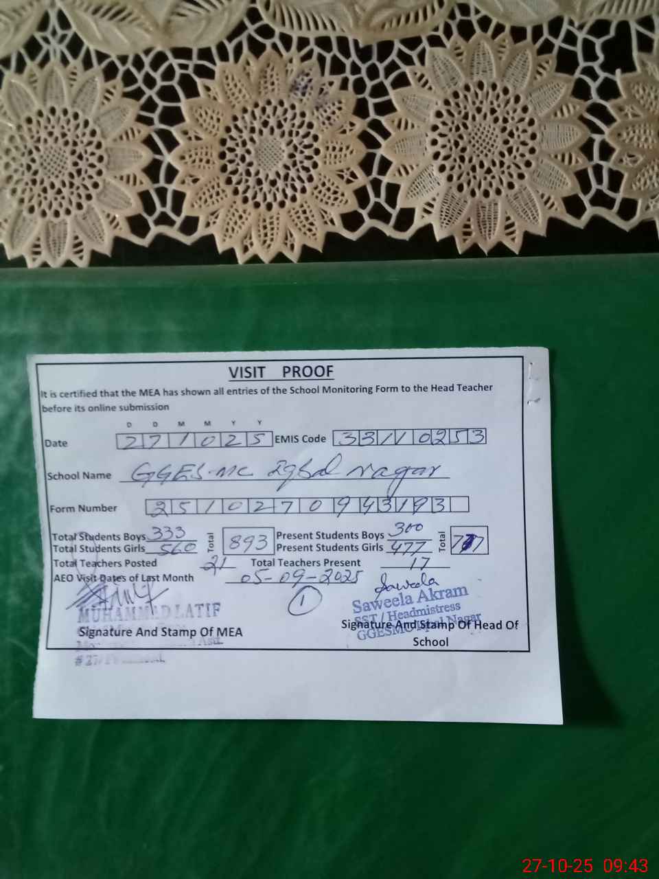 | Attendance Register | Head Teacher | MEA with School | Visit Proof |