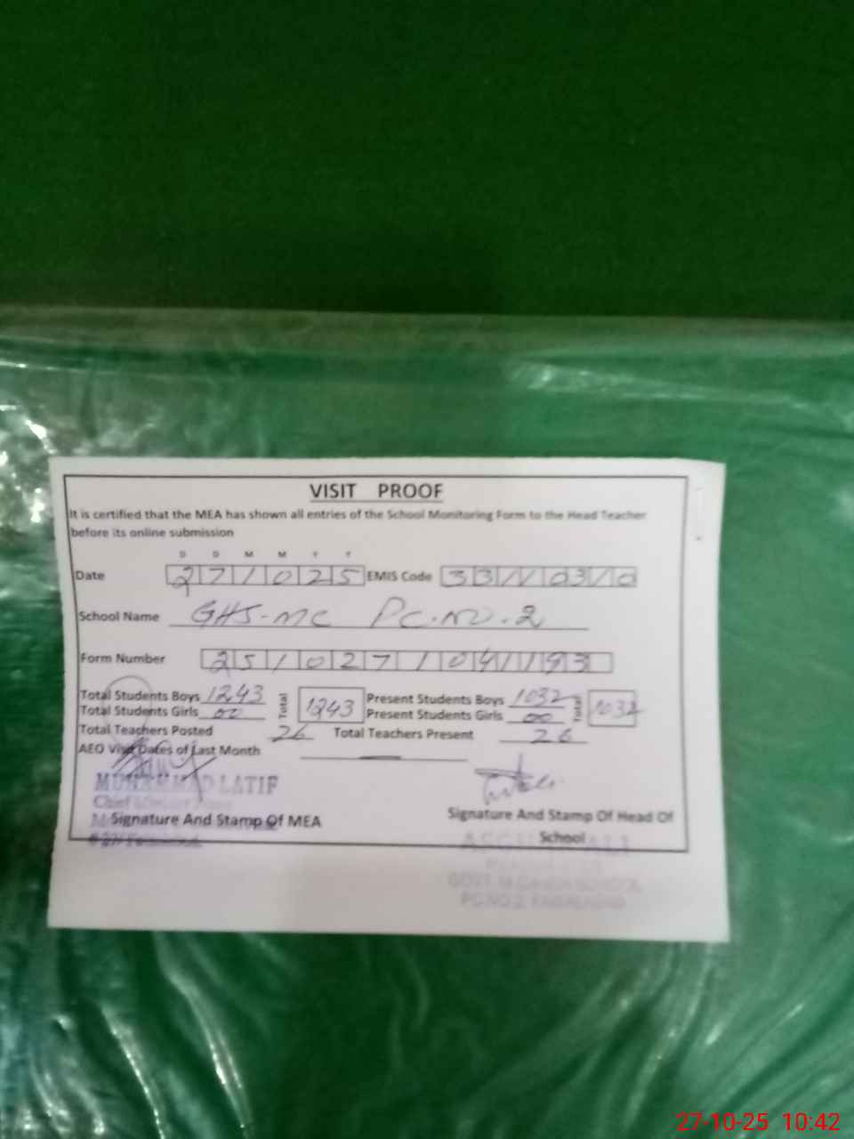 | Attendance Register | Head Teacher | MEA with School | Visit Proof |
