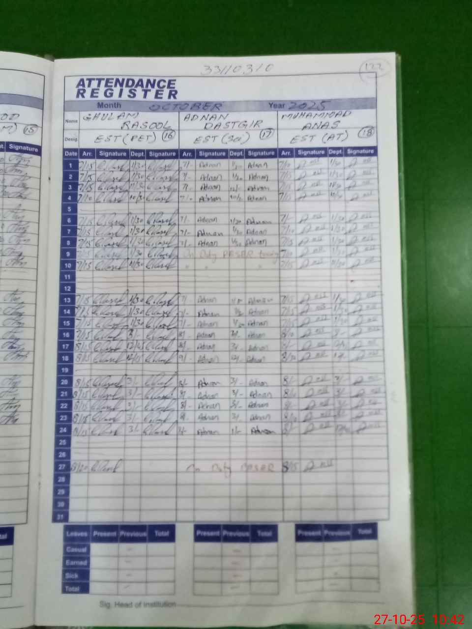 | CNIC | Full Name | Designation | R/C | Absence during last cal. month |