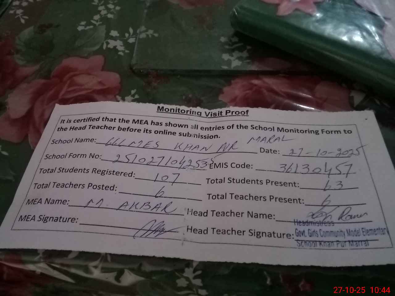 | Attendance Register | Head Teacher | MEA with School | Visit Proof |