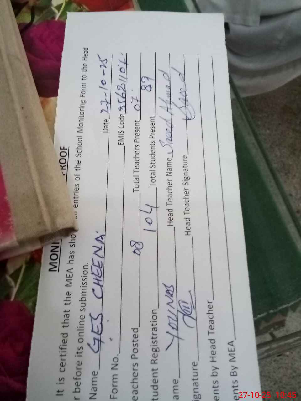 | Attendance Register | Head Teacher | MEA with School | Visit Proof |