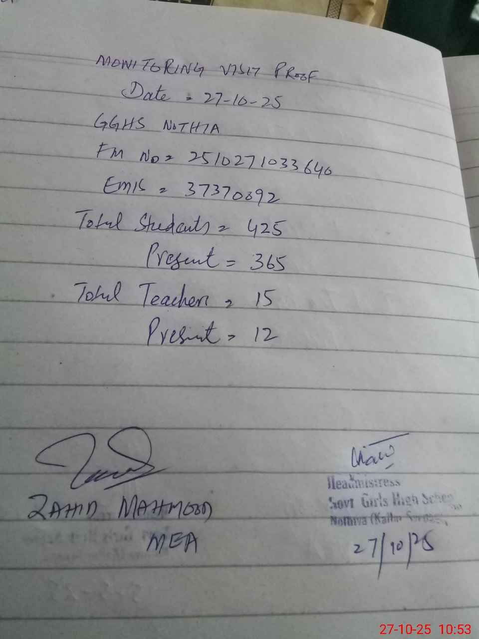 | Attendance Register | Head Teacher | MEA with School | Visit Proof |