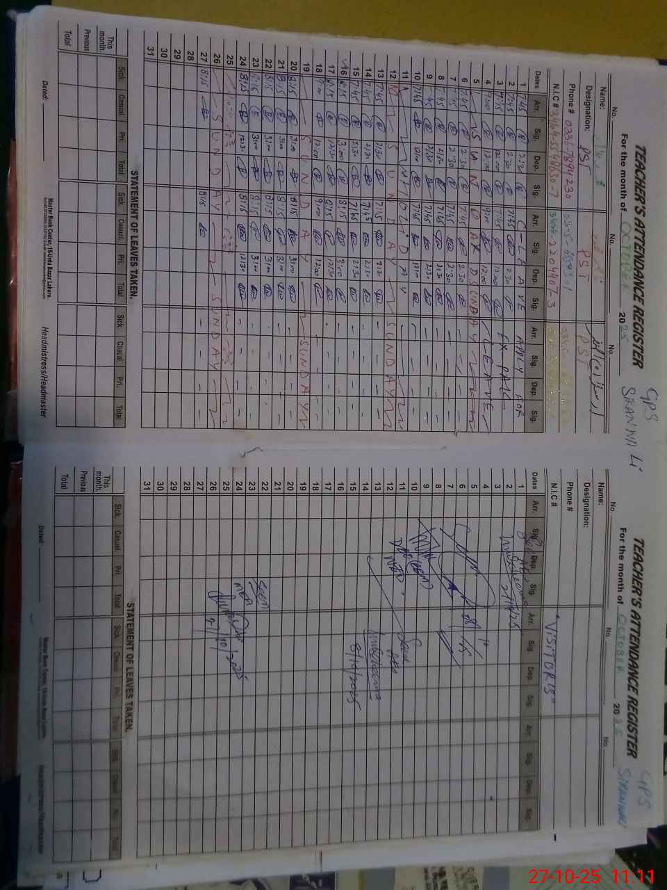 | CNIC | Full Name | Designation | R/C | Absence During Last Calender Month |