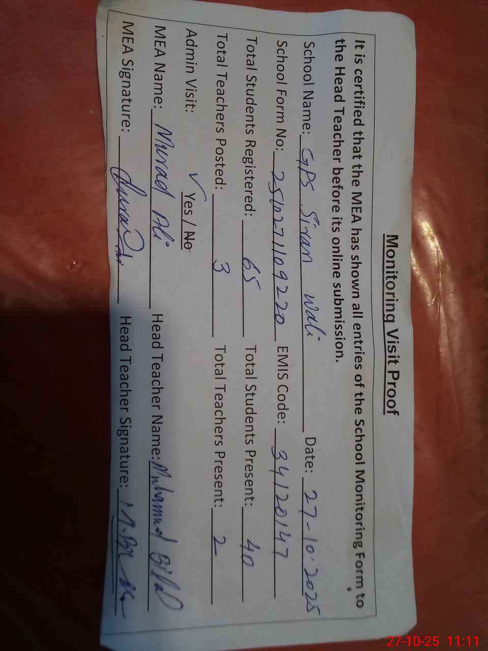 | Attendance Register | Head Teacher | MEA with School | Visit Proof |