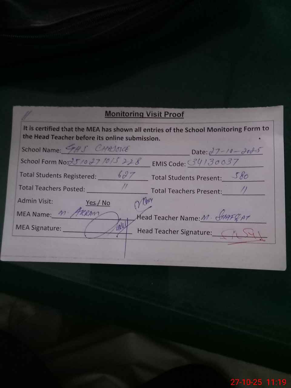 | Monitoring Date: 27-10-2025 | Start Time: 27-10-2025 10:09 AM | End Time: 27-10-2025 11:20 AM | Name of MEA: K-**** Ak**** | |