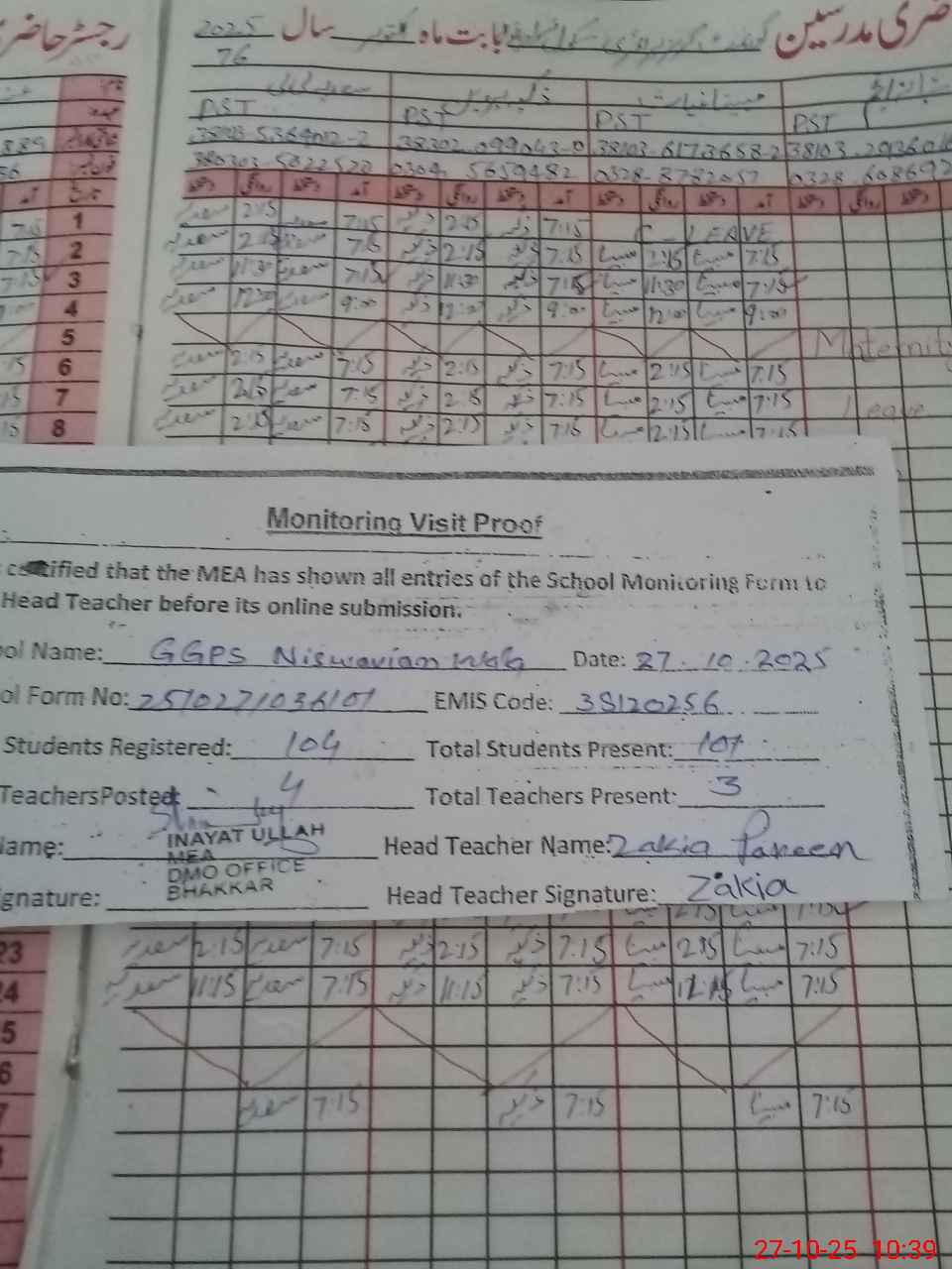 | Attendance Register | Head Teacher | MEA with School | Visit Proof |