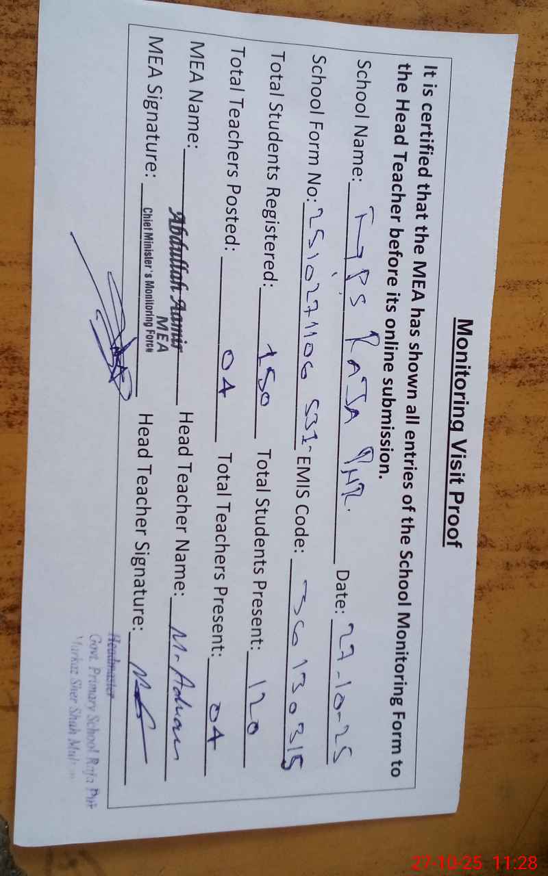 | EMIS Code: 36130315 | Name of School: GPS RAJA PUR P/O MUZAFARABAD CHAH AMIR SHAH WALA | |||