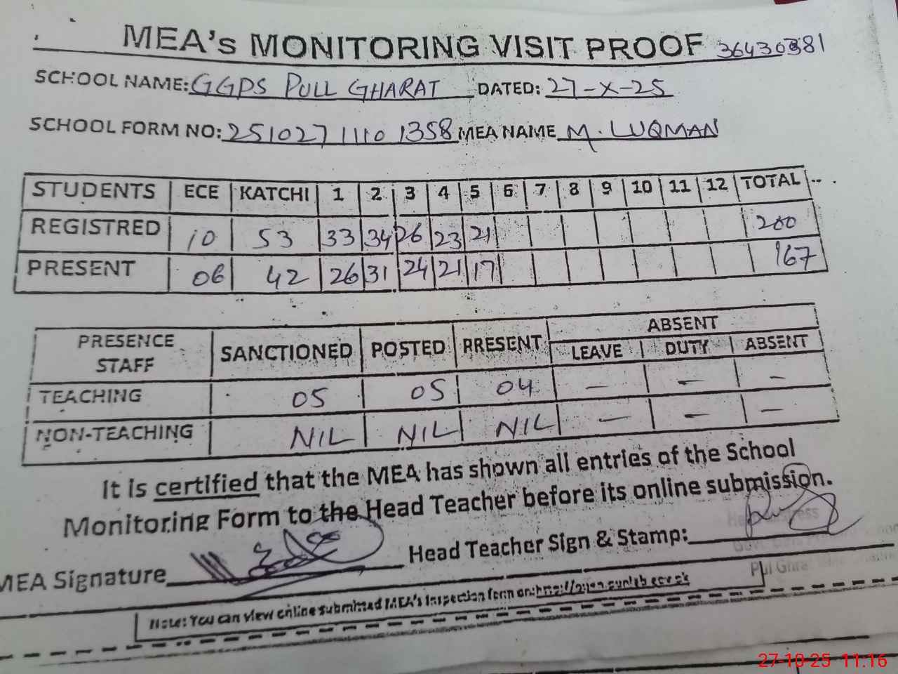 | Attendance Register | Head Teacher | MEA with School | Visit Proof |