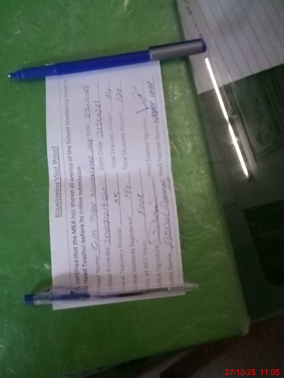 | Attendance Register | Head Teacher | MEA with School | Visit Proof |