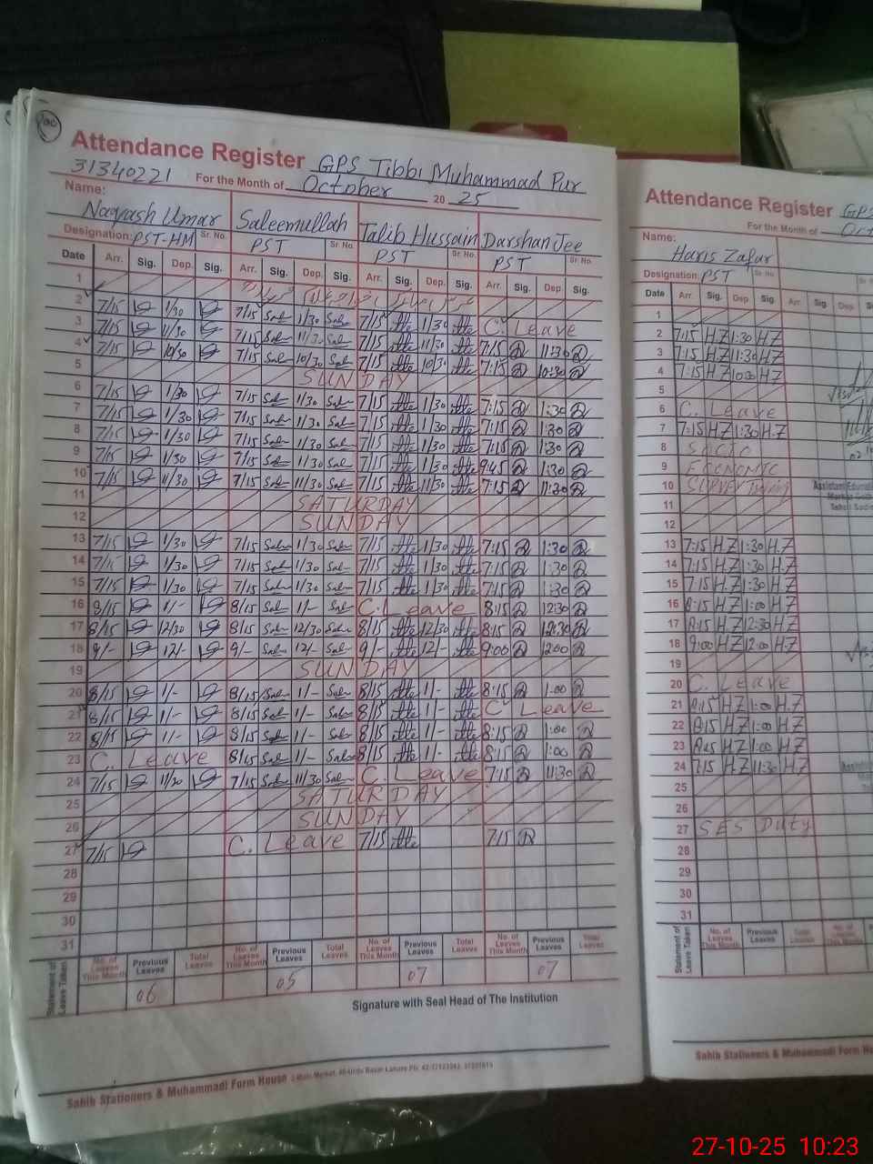 | CNIC | Full Name | Designation | R/C | Absence During Last Calender Month |