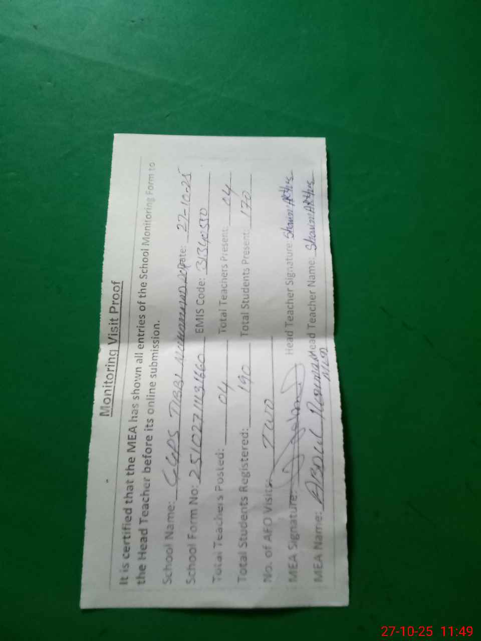 | Attendance Register | Head Teacher | MEA with School | Visit Proof |