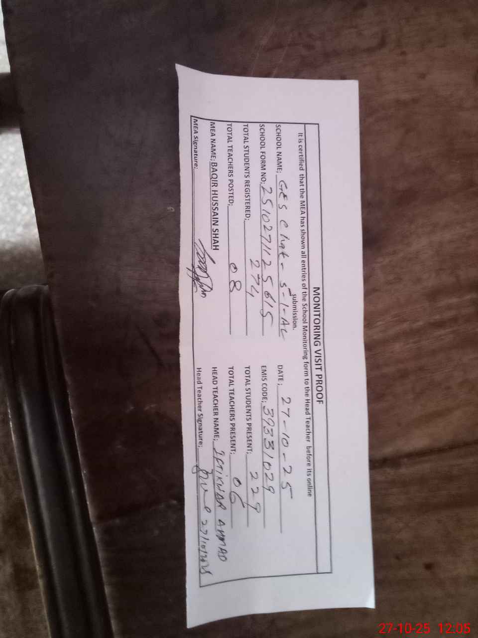| Attendance Register | Head Teacher | MEA with School | Visit Proof |