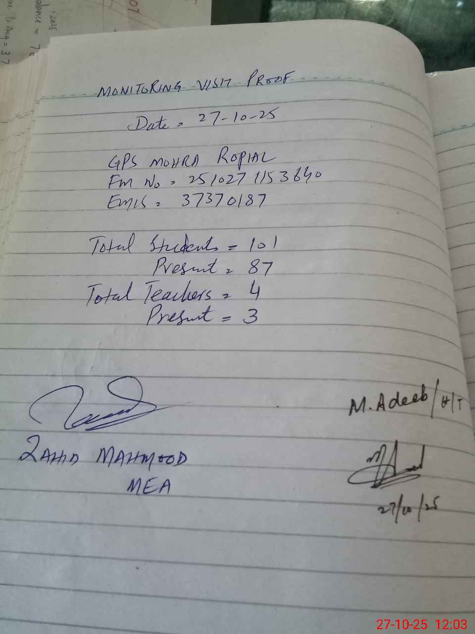| Attendance Register | Head Teacher | MEA with School | Visit Proof |