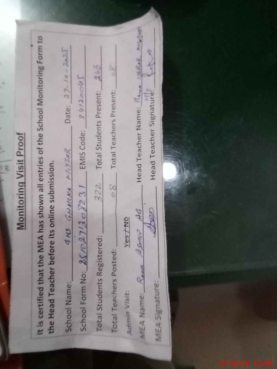 | Attendance Register | Head Teacher | MEA with School | Visit Proof |
