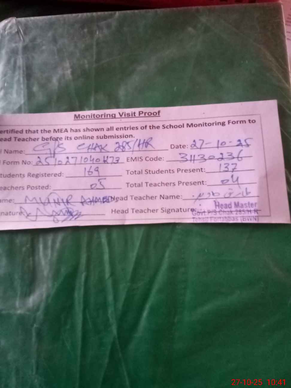 | EMIS Code: 31130236 | Name of School: GPS CHAK NO 285 HR | |||