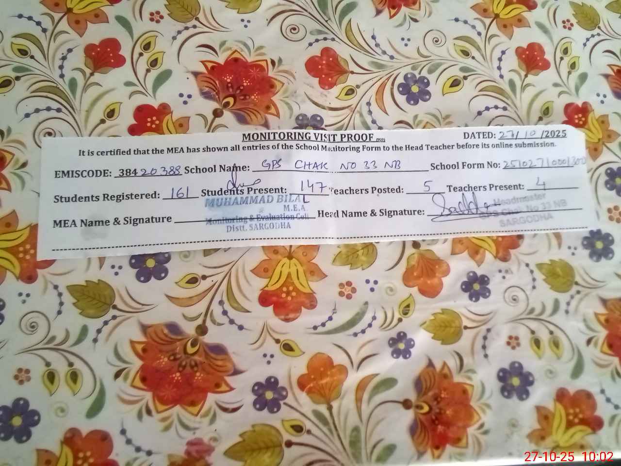 | EMIS Code: 38420388 | Name of School: GPS CHAK NO.33 NB | |||