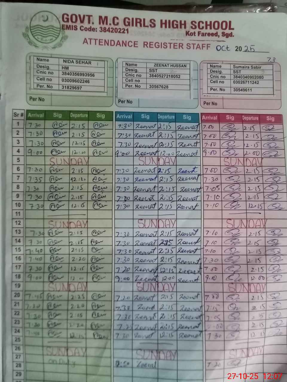 | CNIC | Full Name | Designation | R/C | Absence during last cal. month |
