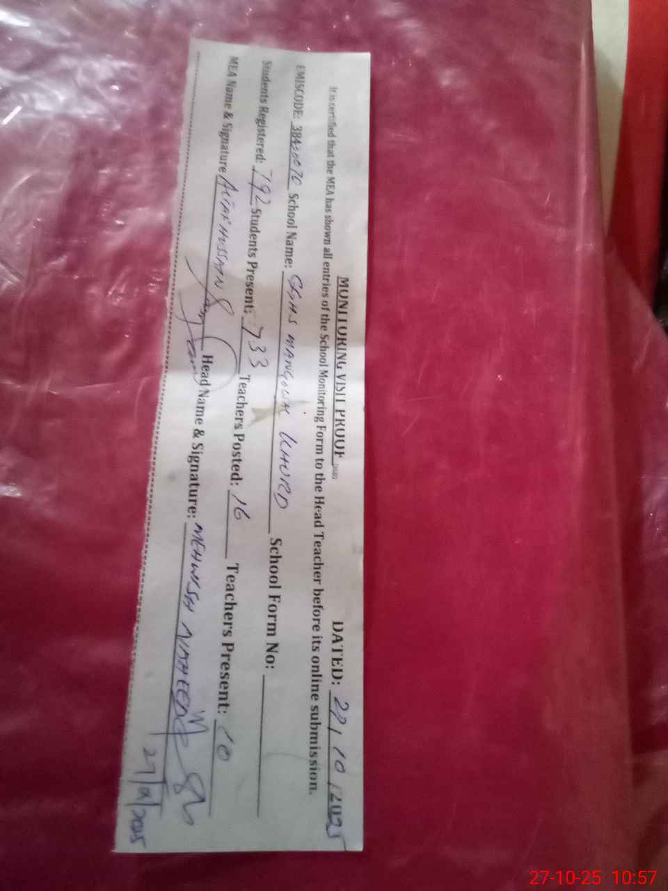 | Attendance Register | Head Teacher | MEA with School | Visit Proof |
