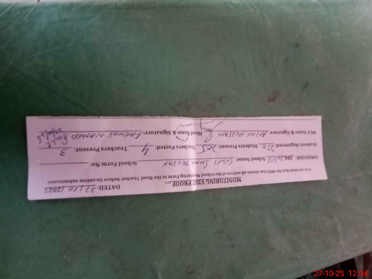 | Attendance Register | Head Teacher | MEA with School | Visit Proof |