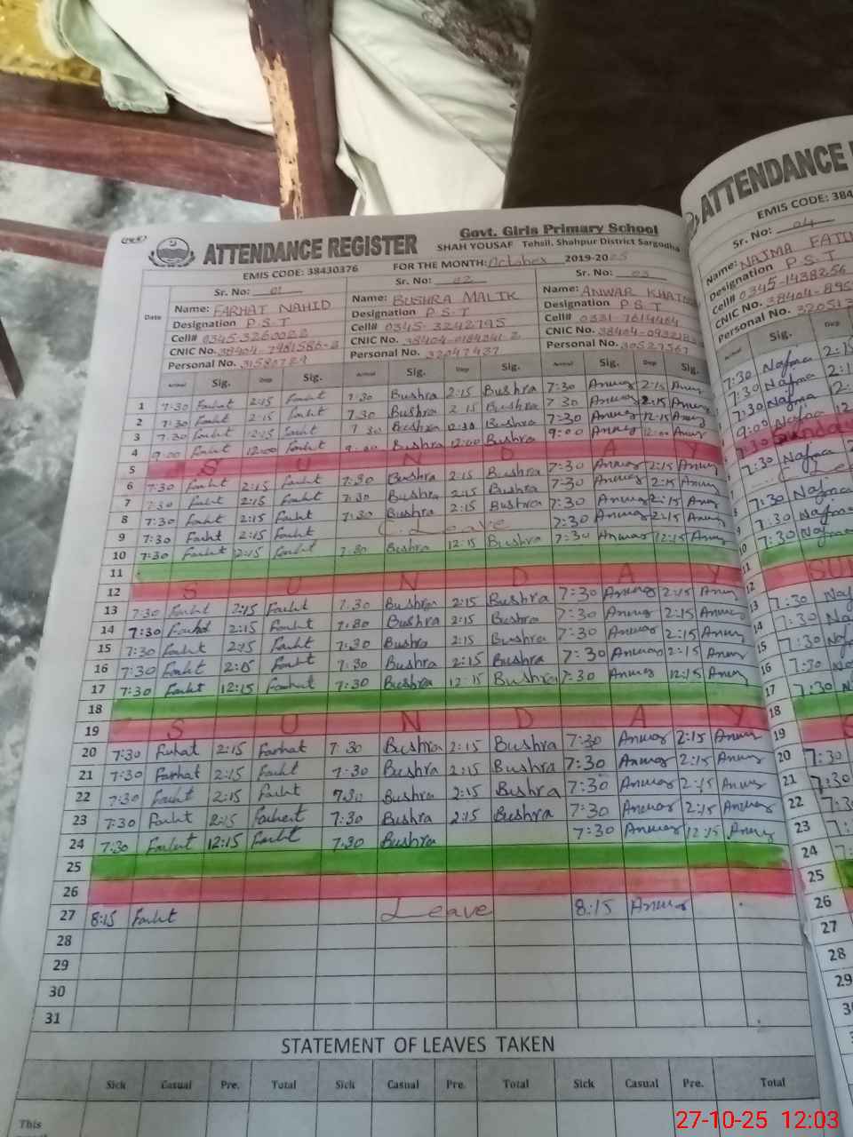 | CNIC | Full Name | Designation | R/C | Absence During Last Calender Month |