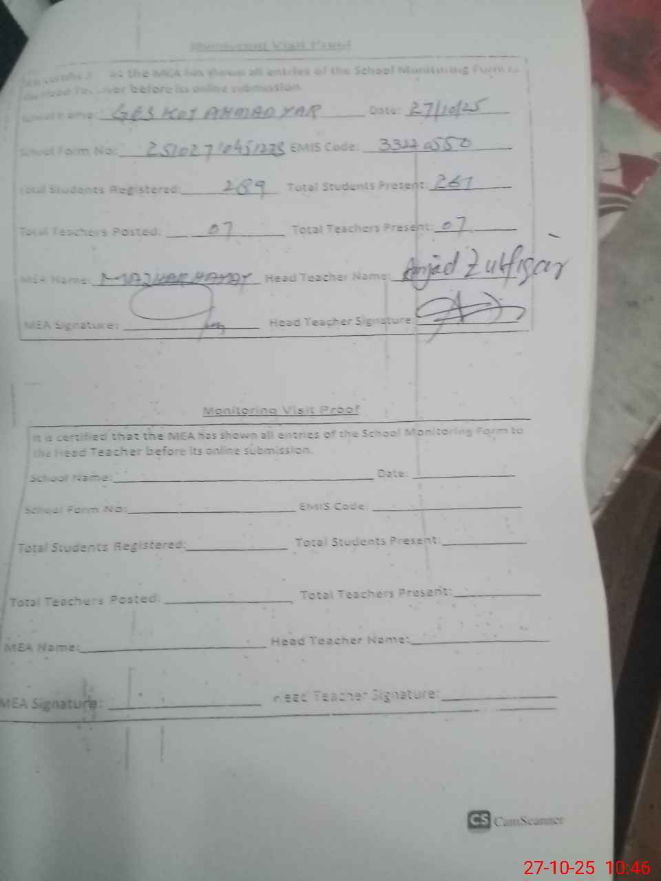 | Name: Amja**** Zu**** Designation: (School Headmaster's/Headmistress's) SSE (Eng Phone/Cell Number: 03**** |