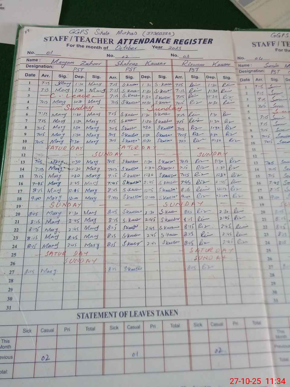 | Monitoring Date: 27-10-2025 | Start Time: 27-10-2025 11:22 AM | End Time: 27-10-2025 11:59 AM | Name of MEA: Kh**** Ri**** | |