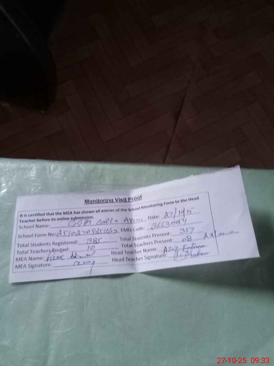 | Attendance Register | Head Teacher | MEA with School | Visit Proof |