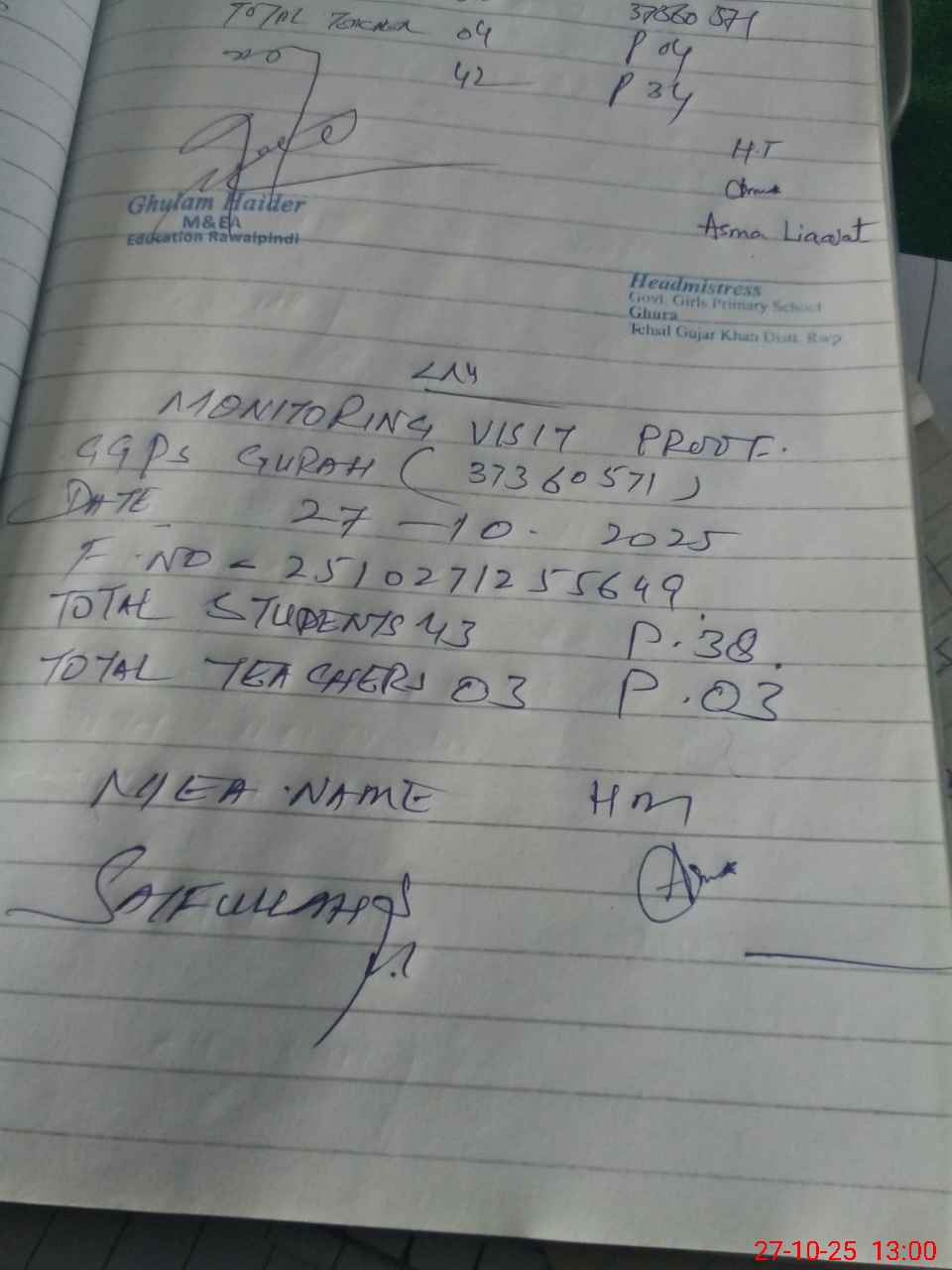 | Attendance Register | Head Teacher | MEA with School | Visit Proof |