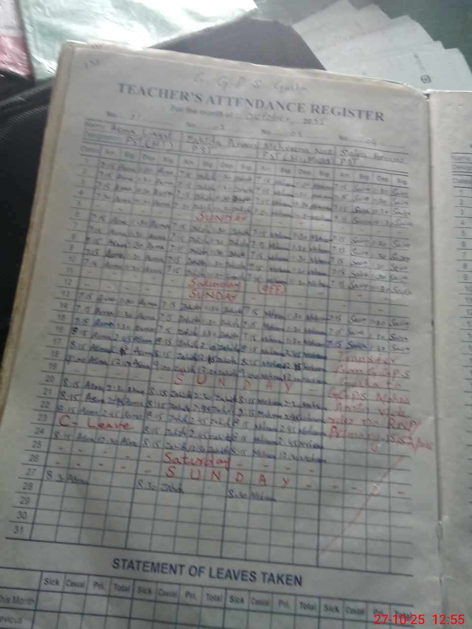 Leave Type | Remarks for Today (Leave,Training, Exam,Absent,Late, Other Duty) |