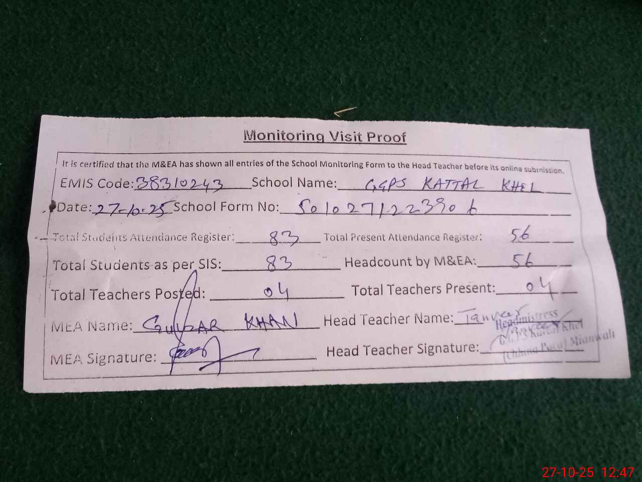 | Attendance Register | Head Teacher | MEA with School | Visit Proof |