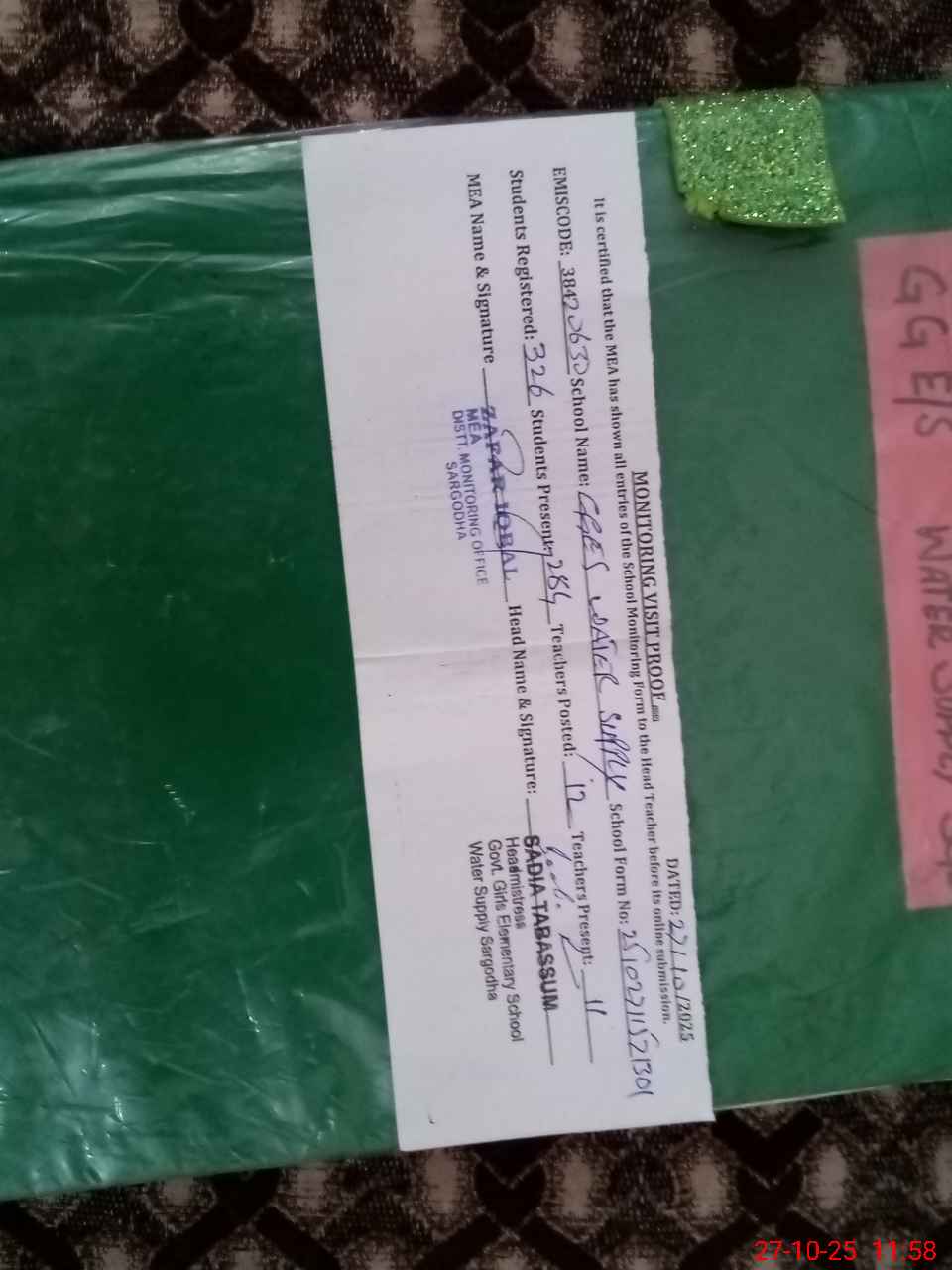 | EMIS Code: 38420630 | Name of School: GGES WATER SUPPLY SARGODHA | |||