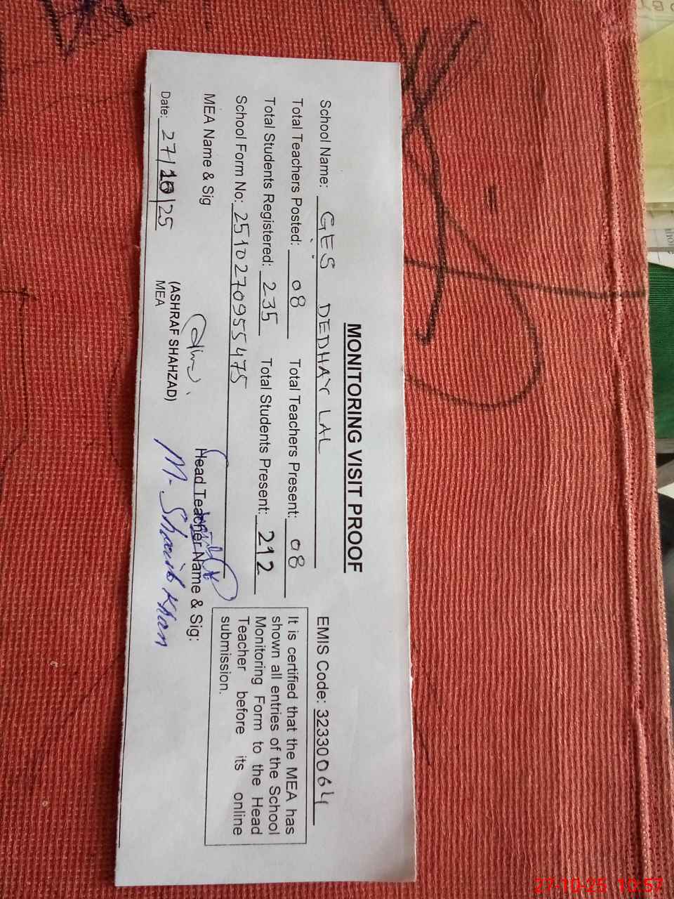 | Attendance Register | Head Teacher | MEA with School | Visit Proof |