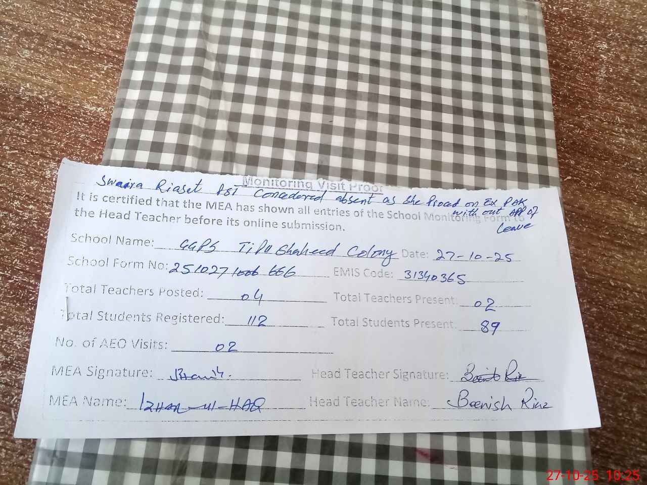 | EMIS Code: 31340365 | Name of School: GGPS TIPU SHAHEED COLONY | |||