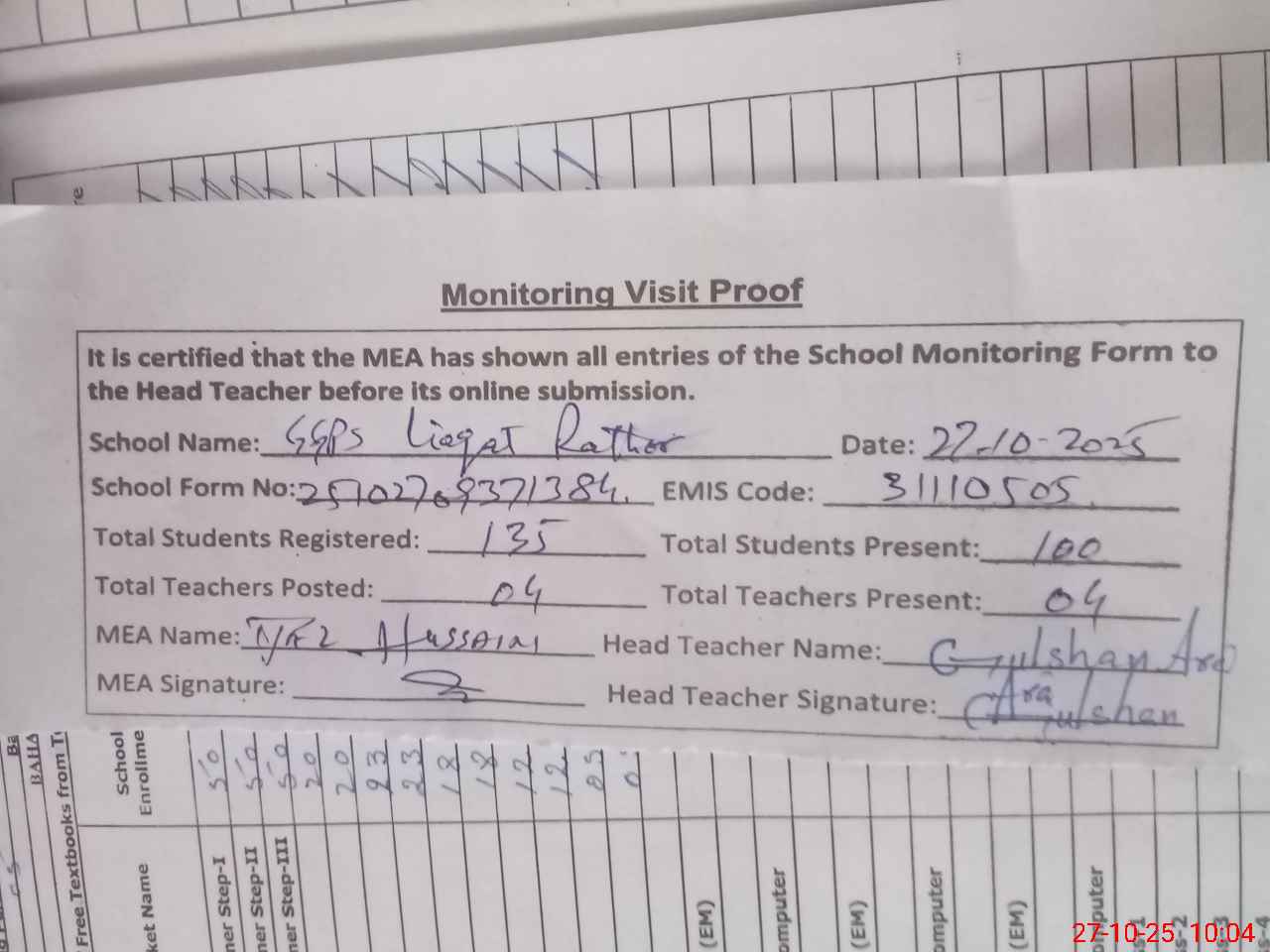 | Attendance Register | Head Teacher | MEA with School | Visit Proof |