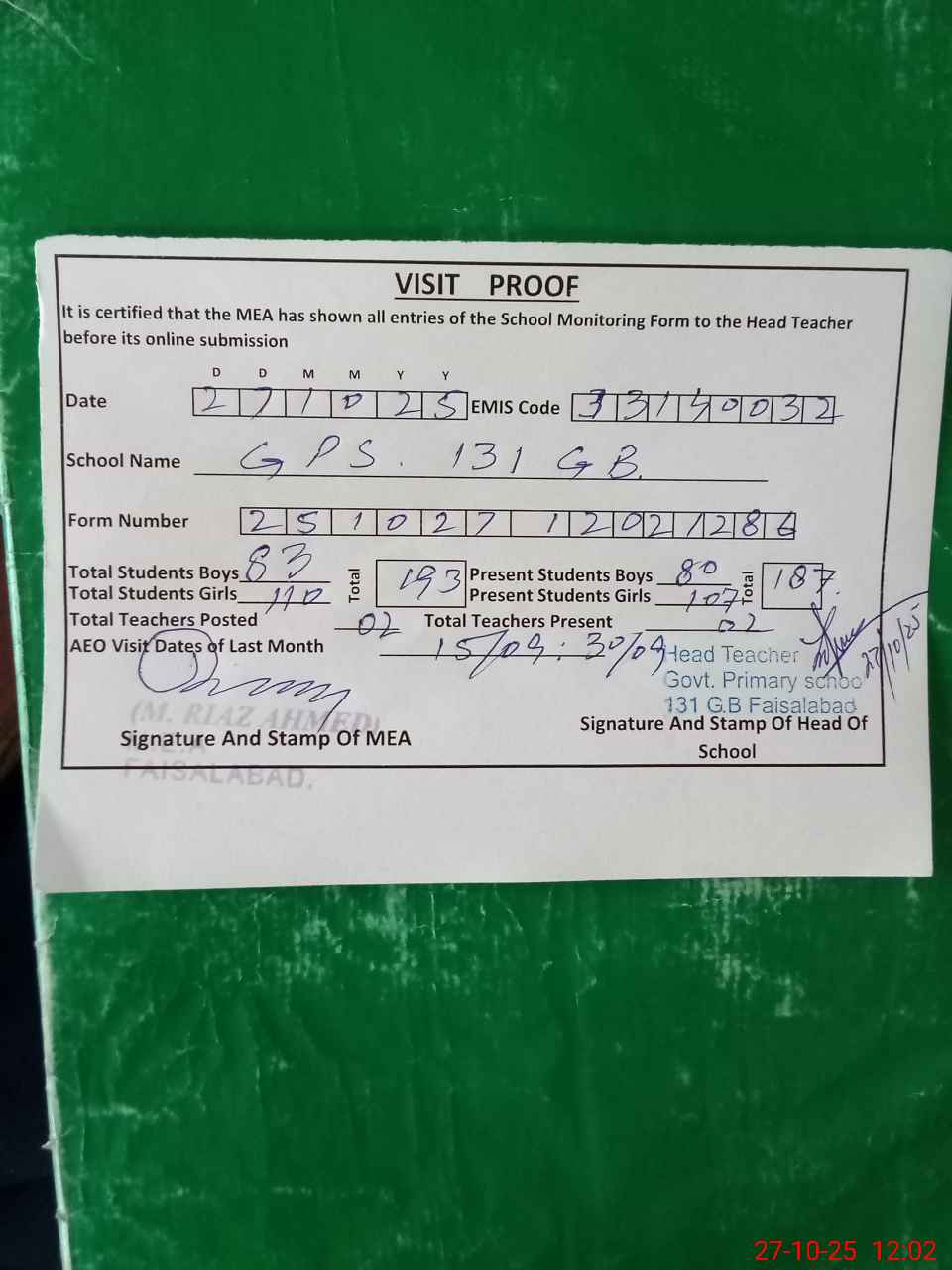 | Attendance Register | Head Teacher | MEA with School | Visit Proof |