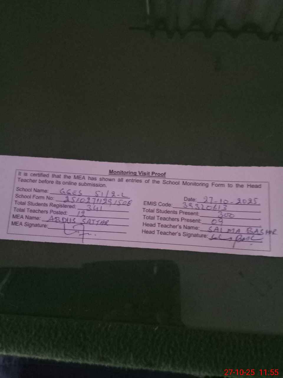 | Attendance Register | Head Teacher | MEA with School | Visit Proof |