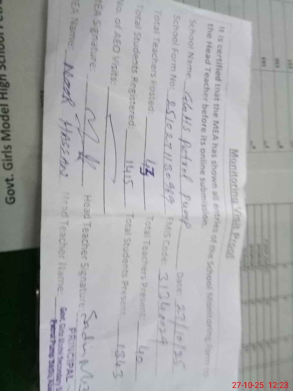 | Attendance Register | Head Teacher | MEA with School | Visit Proof |