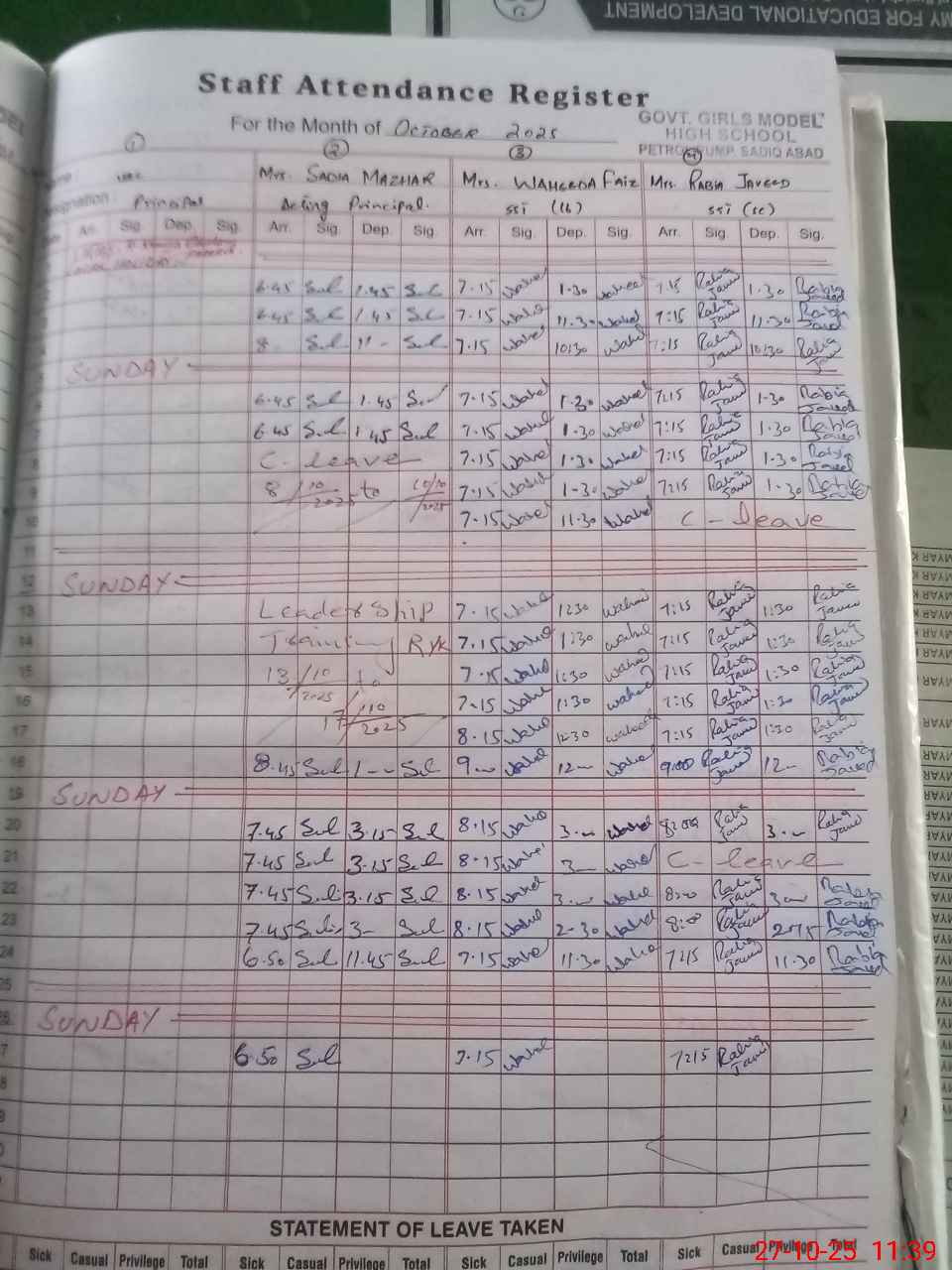 | Leave | Duty | Absent | Maternity | Medical | Ex- Pak |