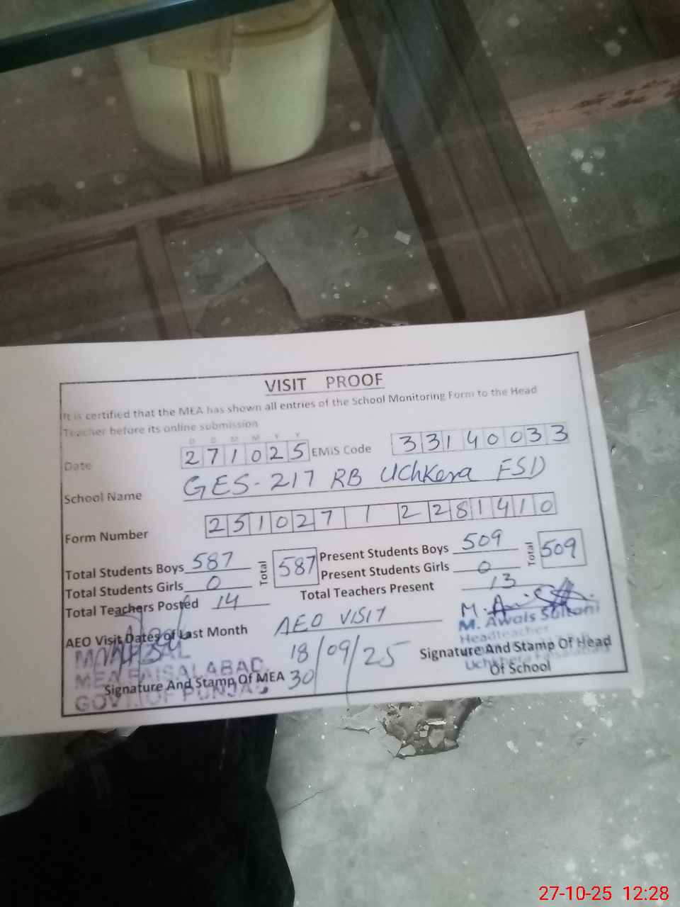 | Attendance Register | Head Teacher | MEA with School | Visit Proof |