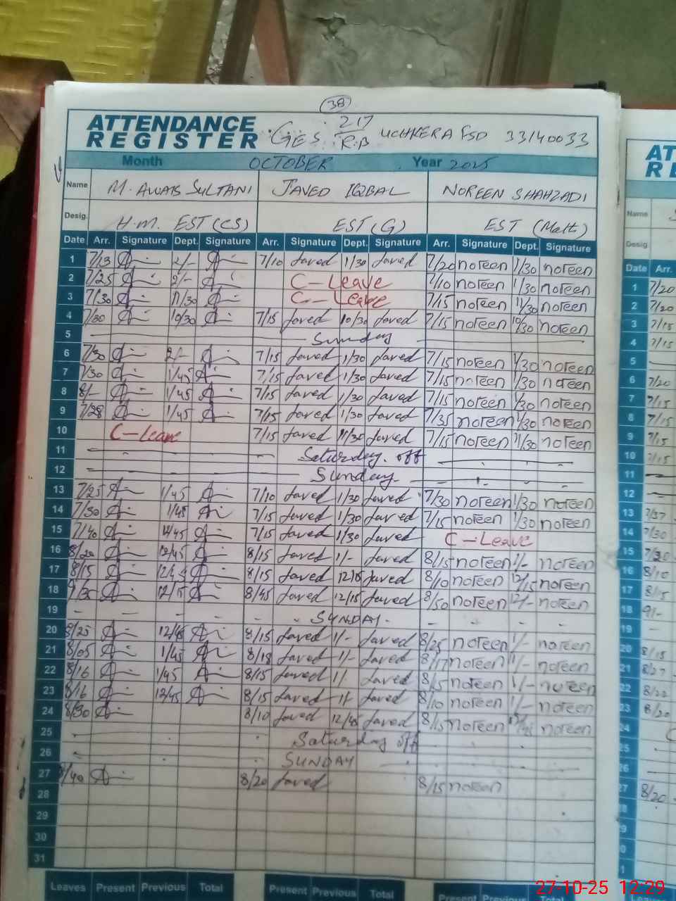 | CNIC | Full Name | Designation | R/C | Absence During Last Calender Month |