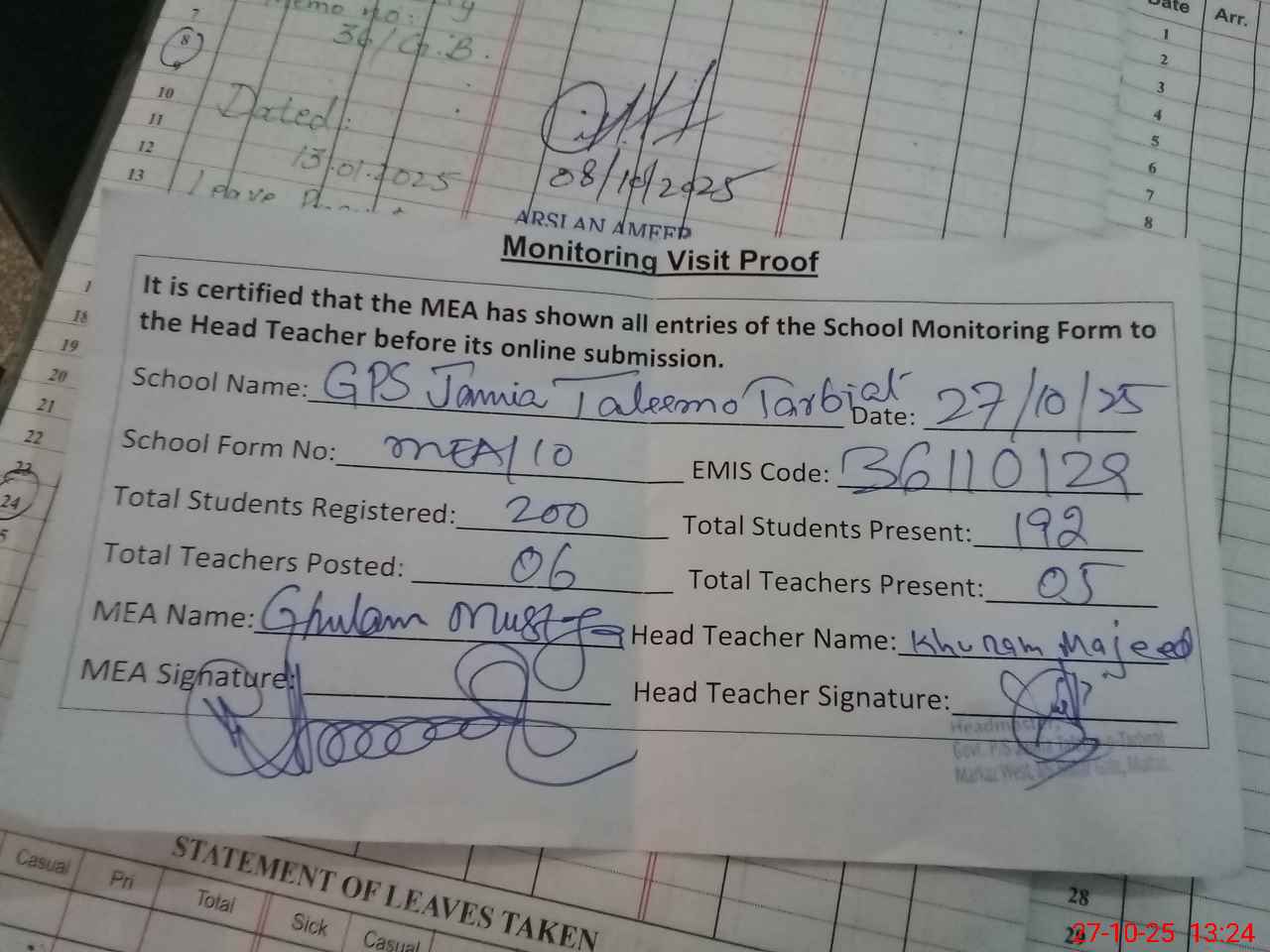 | Attendance Register | Head Teacher | MEA with School | Visit Proof |