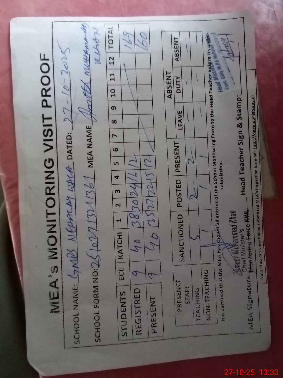 | Attendance Register | Head Teacher | MEA with School | Visit Proof |