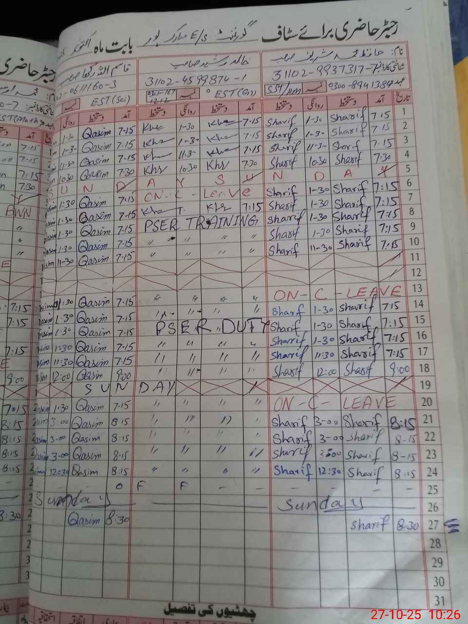 | CNIC | Full Name | Designation | R/C | Absence During Last Calender Month |