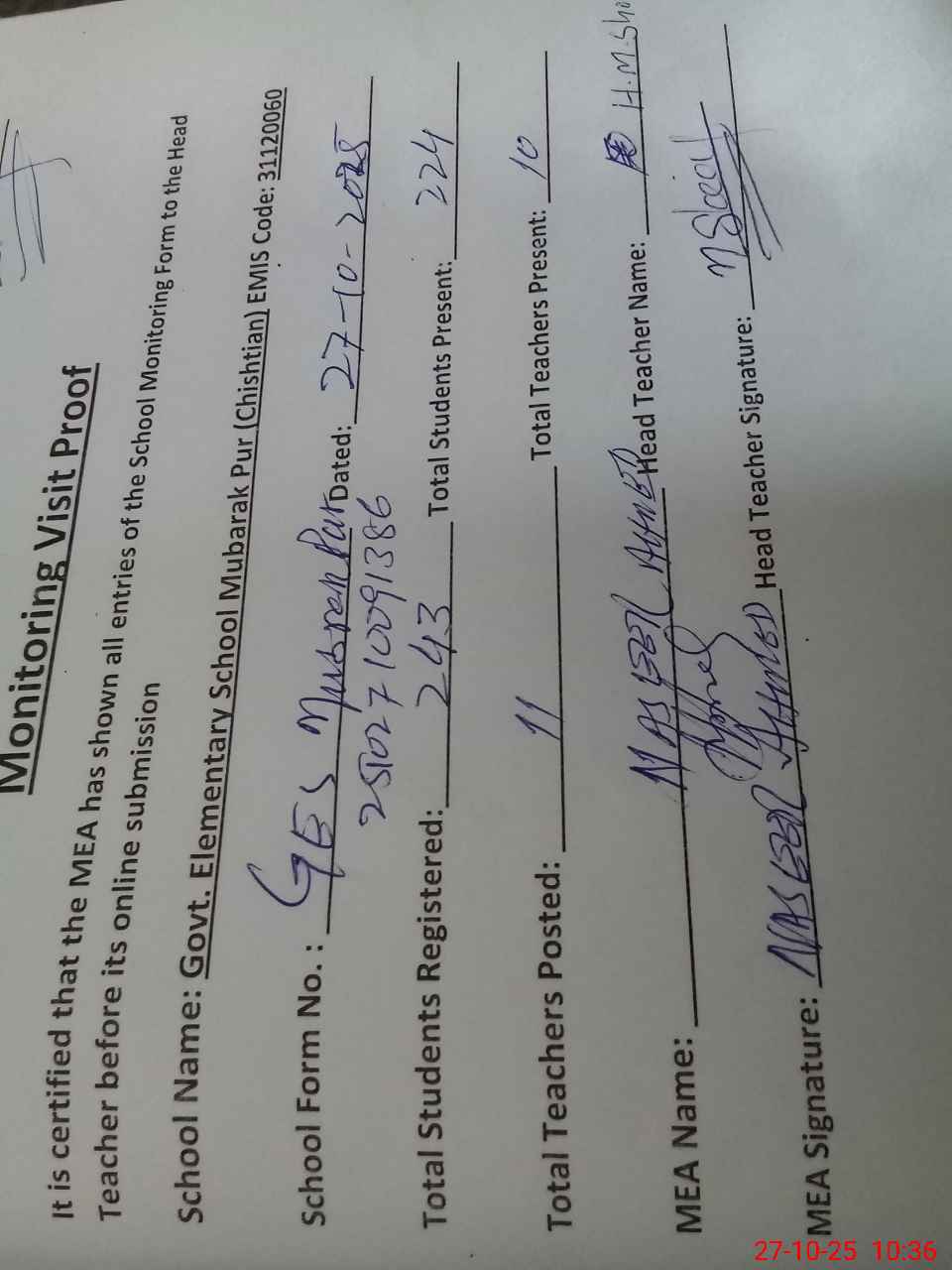 | Attendance Register | Head Teacher | MEA with School | Visit Proof |
