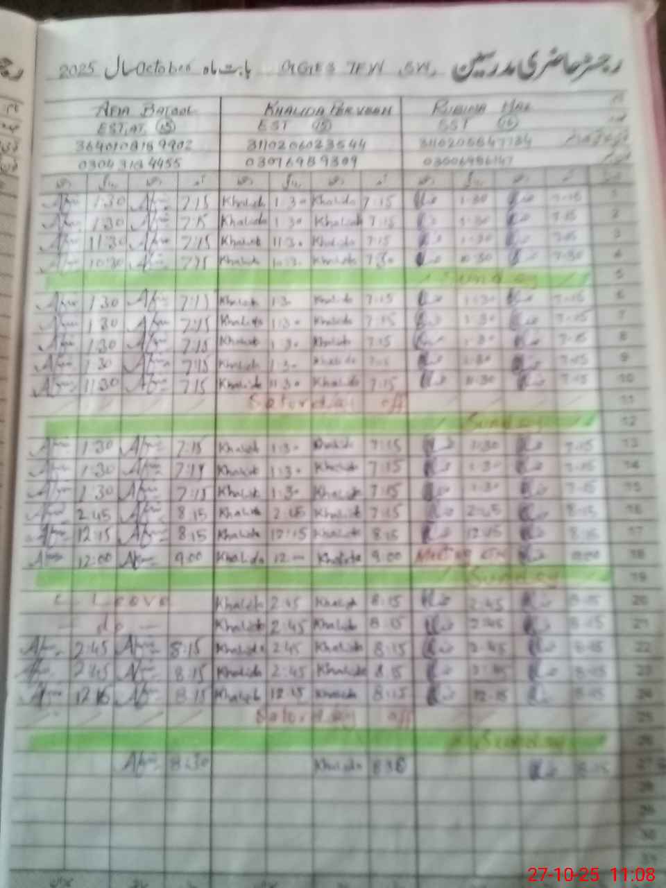 | CNIC | Full Name | Designation | R/C | Absence during last cal. month |