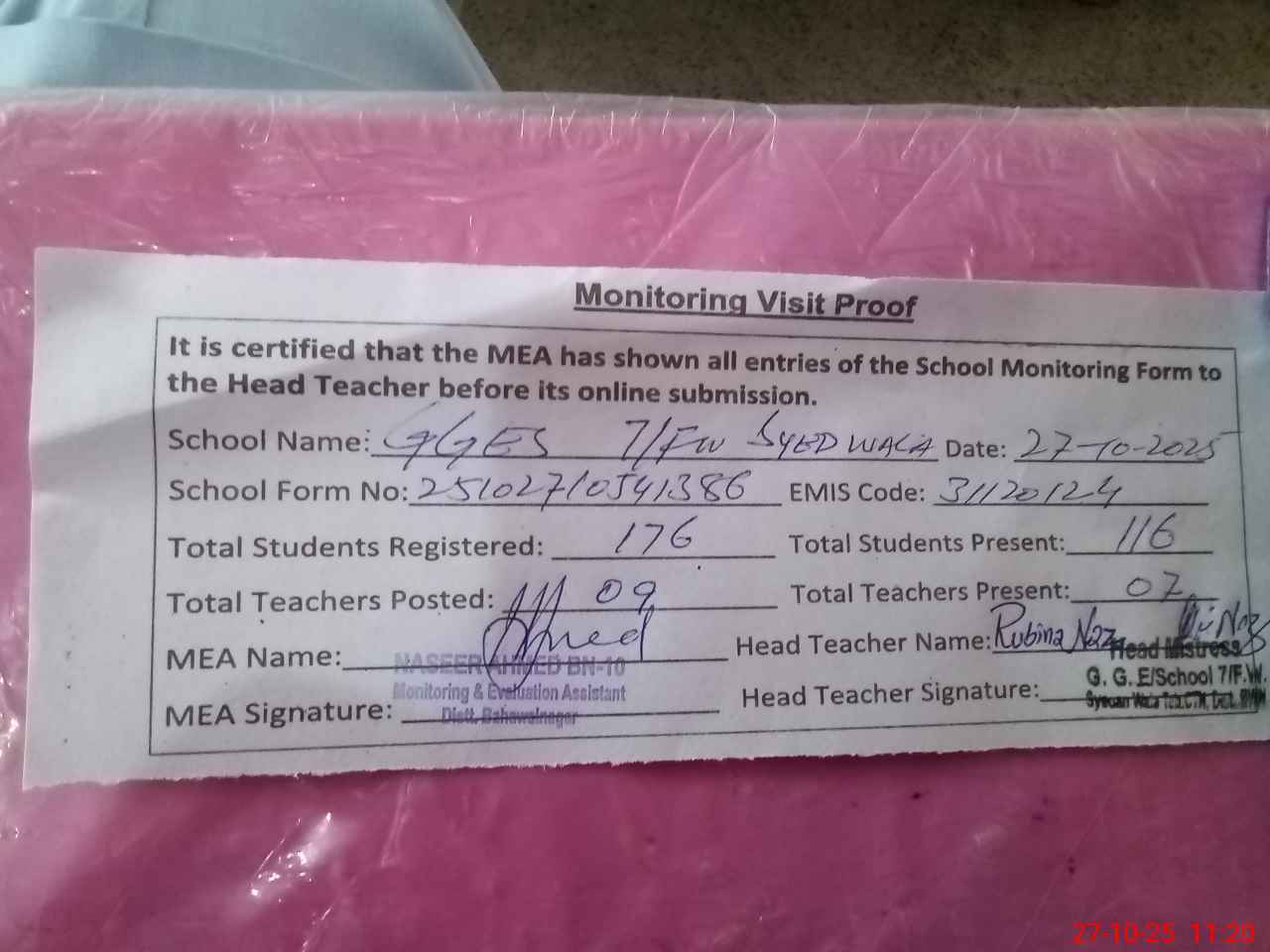 | EMIS Code: 31120124 | Name of School: GGES CHAK NO 7/FW SYED WALA | |||